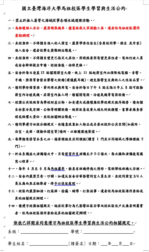 | 說明:本校區位處馬祖,老師授課皆需搭飛 機及運輸船才 可 抵達,且師生皆住校,無自 行騎駛車輛 學生宿舍 |