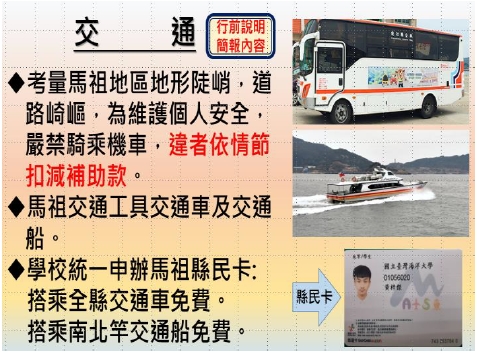 | 說明:召開學生至馬祖校區行前說明會告知嚴禁 騎乘機車,於馬祖求學期間搭乘大眾運輸工具 |